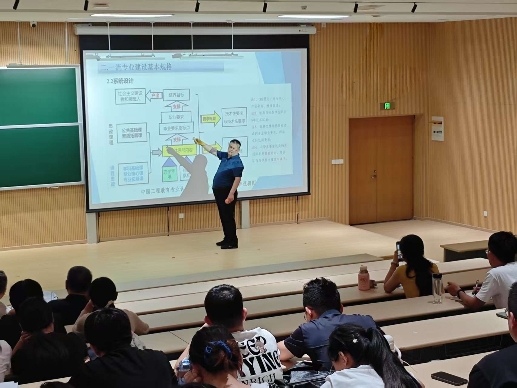 在课程设计环节,范辉教授借助中国工程教育专业认证逻辑图,清晰呈现课程体系与毕业要求、培养目标的关联,强调课程思政与学科基础课程协同育人。教师们紧跟讲解节奏,积极思考互动,现场交流氛围浓厚。
