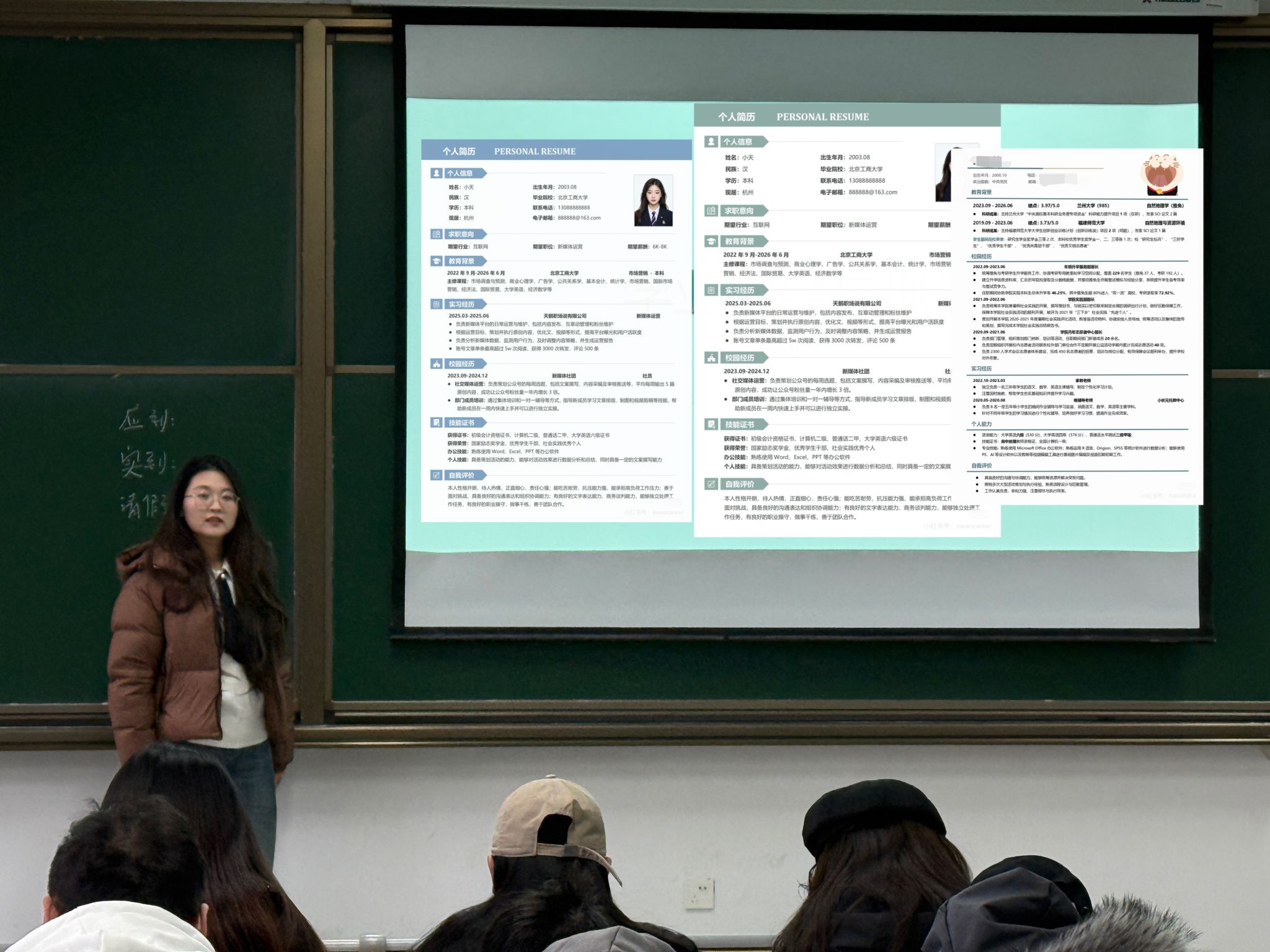 紧扣“三创”理念中“创新课堂模式、创新培养模式”的要求,高月老师为两个班级量身定制“分班精讲+交叉交流+一对一打磨”的指导形式。考虑到计算机、大数据两个专业的关联性与差异性,先分别在班级内结合专业岗位(如软件开发、数据分析师)拆解简历撰写要点,再组织两班学生跨专业交流,分享不同领域的求职视角与技能呈现技巧。指导过程中,高月老师还引入IT行业优秀简历案例,结合学生的课程设计、实训项目等经历,现场演示如何将专业能力转化为简历亮点,让抽象的撰写方法变得具象可学。