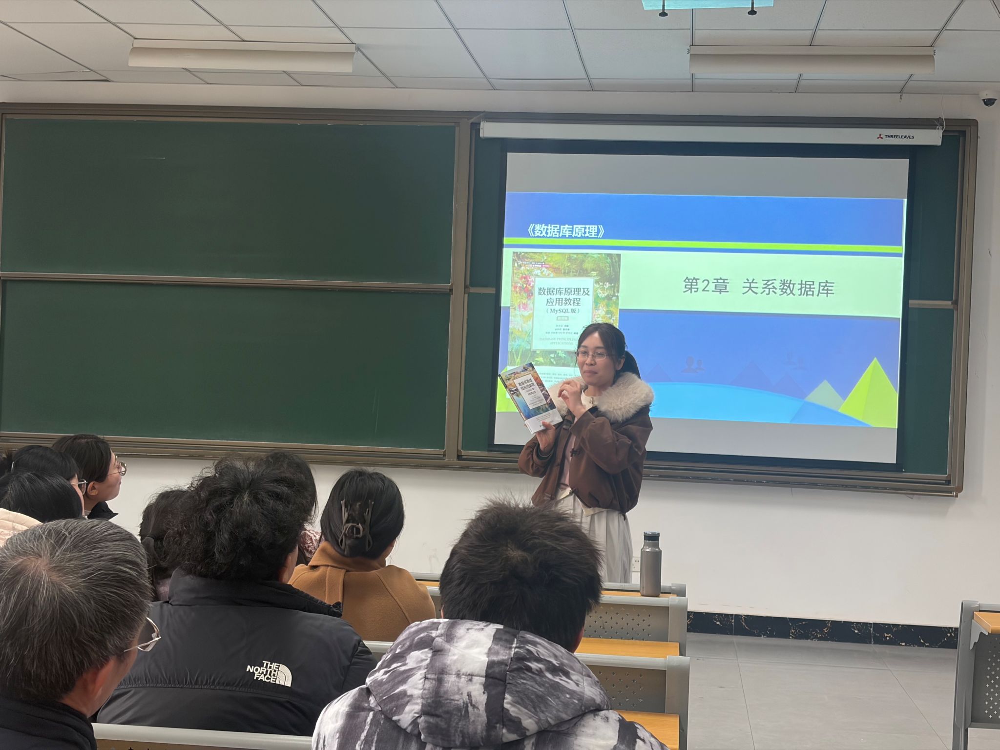 活动中,数据库系统课程负责人徐靖老师担任主讲人,结合多年教学经验与学科前沿动态,从教学大纲修订、授课计划安排、教学内容优化及课堂改革方向四个维度展开系统分享。她提出,数据库系统课程需强化实践环节与理论知识的融合,通过引入企业级案例和项目驱动教学法,提升学生的工程应用能力;同时,针对课堂改革,她建议推广“线上线下混合式教学模式”,利用学习通等数字化工具增强课堂互动性,激发学生学习主动性。