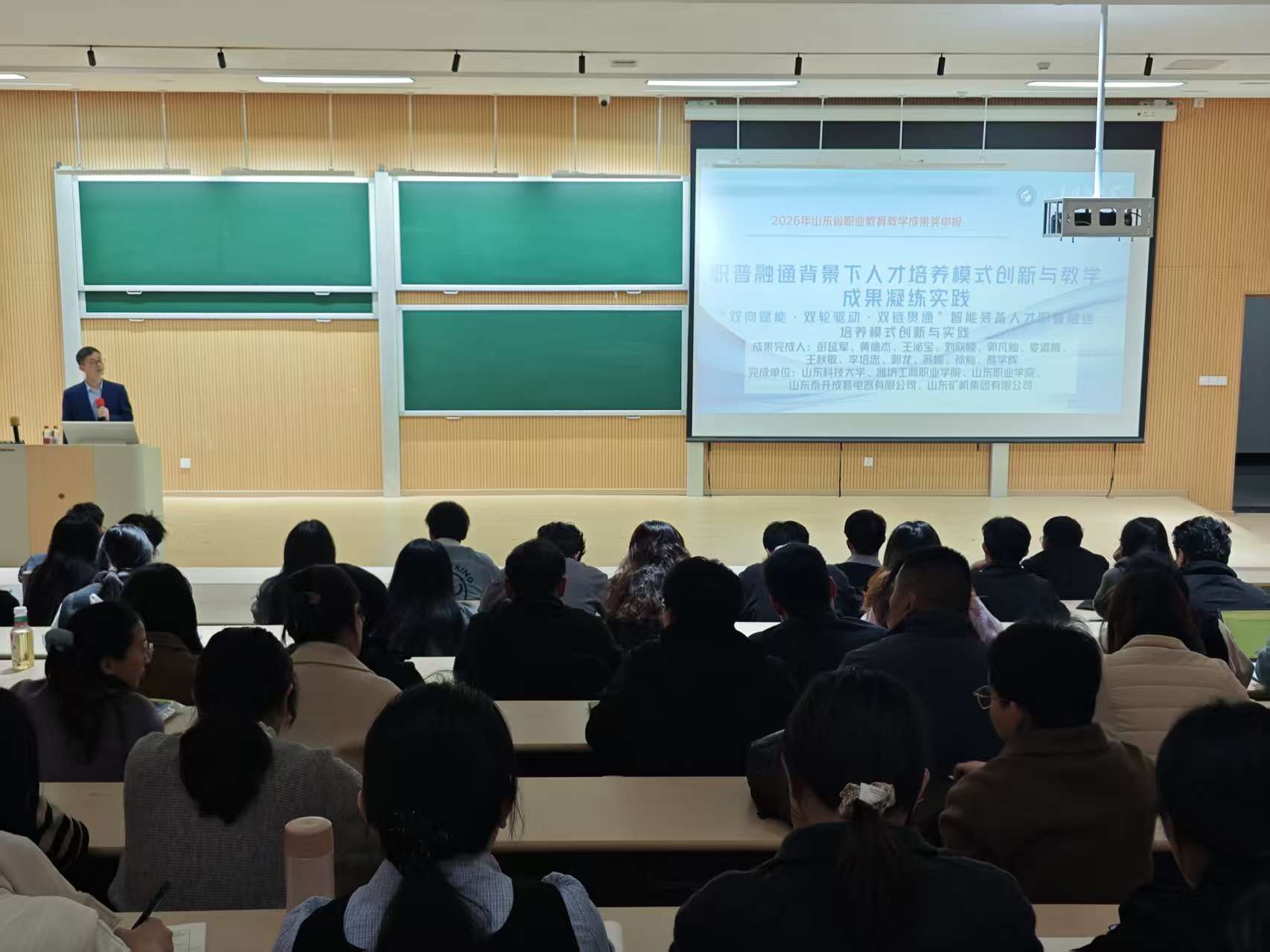 为深化学院人才培养模式改革,助力教师精准把握职普融通教育发展趋势,提升教学成果申报与凝练能力,2026年3月25日下午,大数据学院特邀山东科技大学彭延军教授开展专题学术讲座。学院全体教师参与本次学习交流活动,讲座现场氛围浓厚,学习氛围热烈。