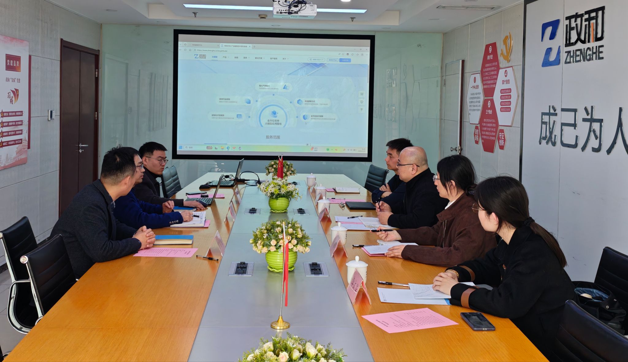 随后,交流团队到访政和科技,与企业副总经理赵西法、研究院院长张庆文、人力总监罗言斐等相关负责人展开座谈。会上,政和科技相关负责人对企业在产业互联网、科技成果转化、专精特新企业服务等领域的业务布局、技术应用与发展成果进行了详细介绍,重点讲解了大数据技术在产业赋能、政策服务、科技咨询等方面的实践案例。学院教师结合专业教学与科研工作,与企业方就产业互联网发展背景下的技术人才培养重点、校企协同开展科研项目、实习就业合作等内容进行深度沟通。企业方对学院的人才培养理念表示认可,并针对大数据专业人才培养提出了贴合产业需求的宝贵建议。