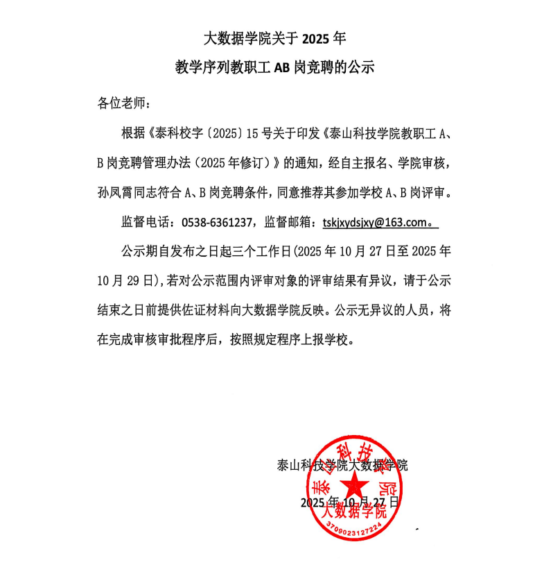 大数据学院关于2025年教学序列教职工AB岗竞聘的公示