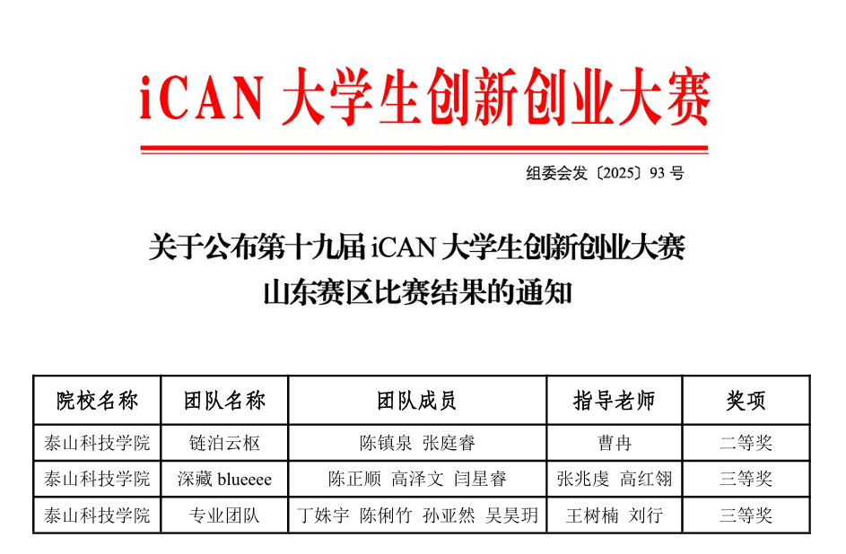 为深入贯彻立德树人根本任务,全面推进素质教育创新,切实提升学生的创新意识和实践能力,我校积极动员广大教师和学生踊跃参与各类学科竞赛与创新创业活动,持续推进“教育教学三提三创”主题年系列举措,不断完善课程教学与实践平台建设,努力打造“以赛促学、以赛促创、以赛促能”的育人模式。由中国创造学会主办的第十九届iCAN大学生创新创业大赛山东赛区比赛结果正式揭晓,我校大数据学院学子在本次比赛中表现出色,最终荣获省级二等奖1项、三等奖2项。