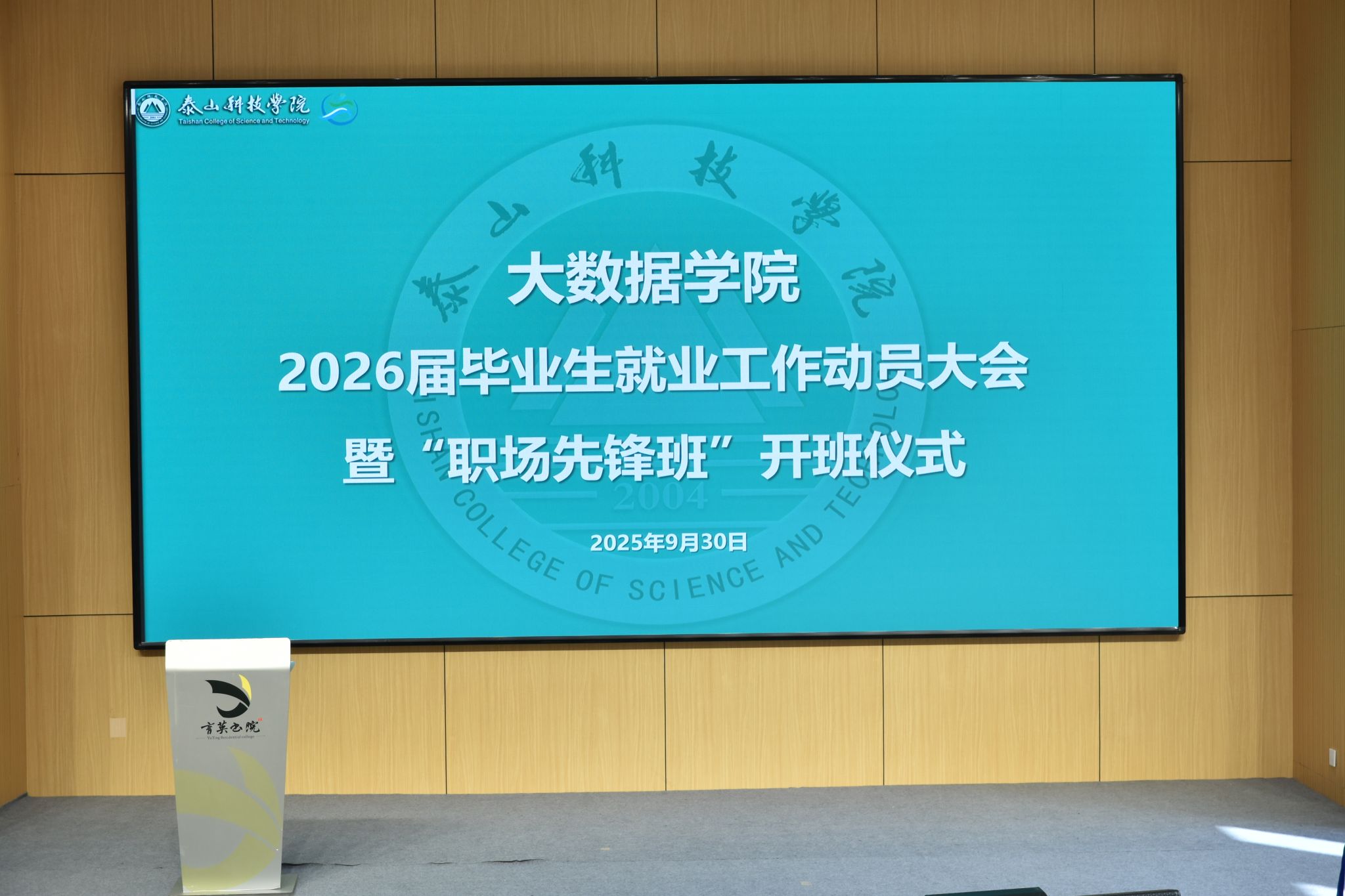 9月30日上午10:30,泰山科技学院大数据学院2026届毕业生就业工作动员大会暨“职场先锋班”开班仪式在育英书院圆满落幕。山东菲利信数字科技有限公司副总经理李彪,校学生工作处、就创中心主任王焱,大数据学院副院长马栋,院长助理贾全秋,校就业创业指导与服务中心综合科科长刘文斌,校就业创业导师闫秋梅等领导嘉宾出席此次会议。会议由2026届毕业生辅导员东野圣萍老师主持,大数据学院教师代表、毕业班辅导员,“职场先锋班”全体学员及部分2026届毕业生共同参与,为毕业生的就业筹备与职场成长按下“启动键”。