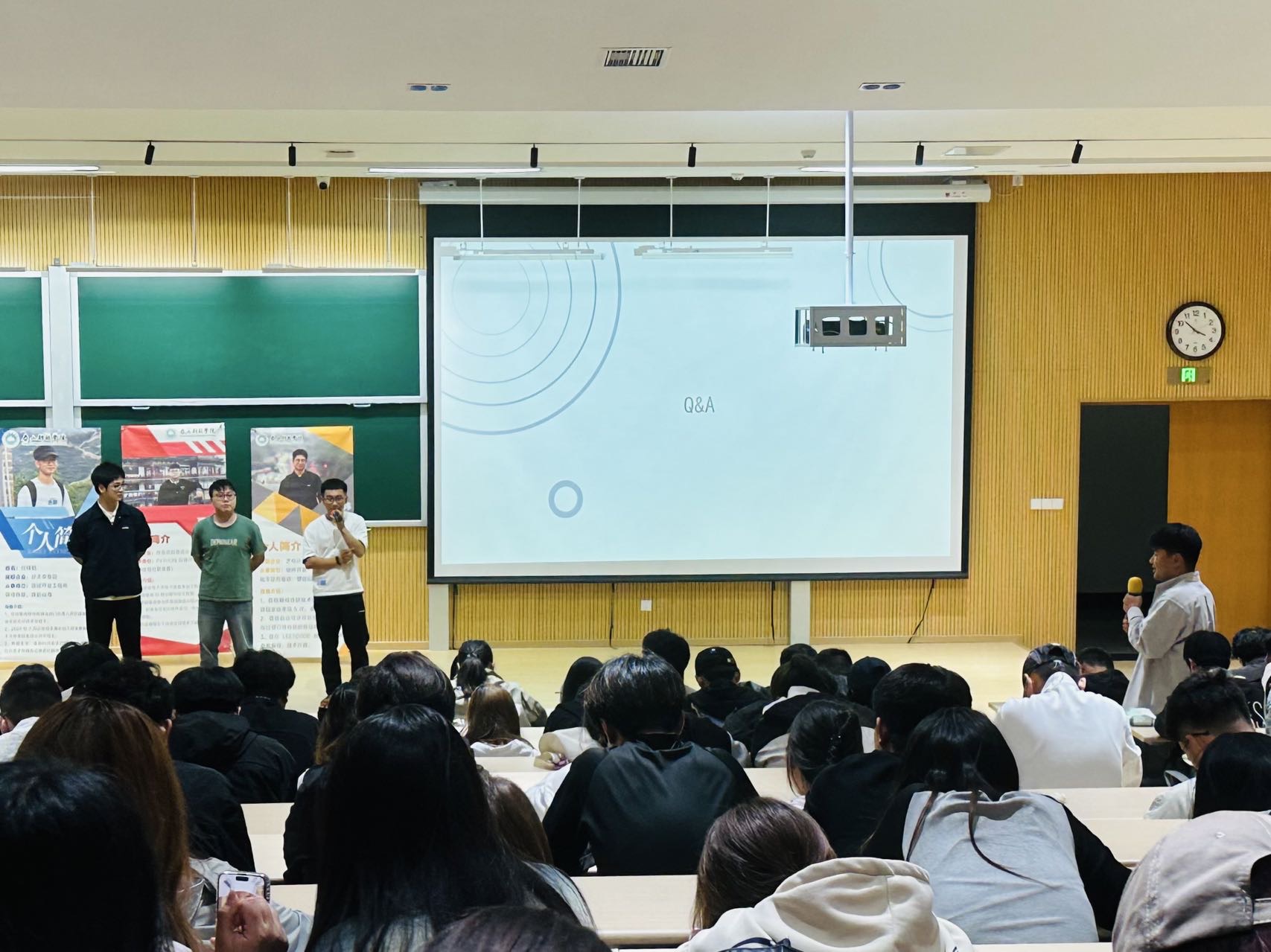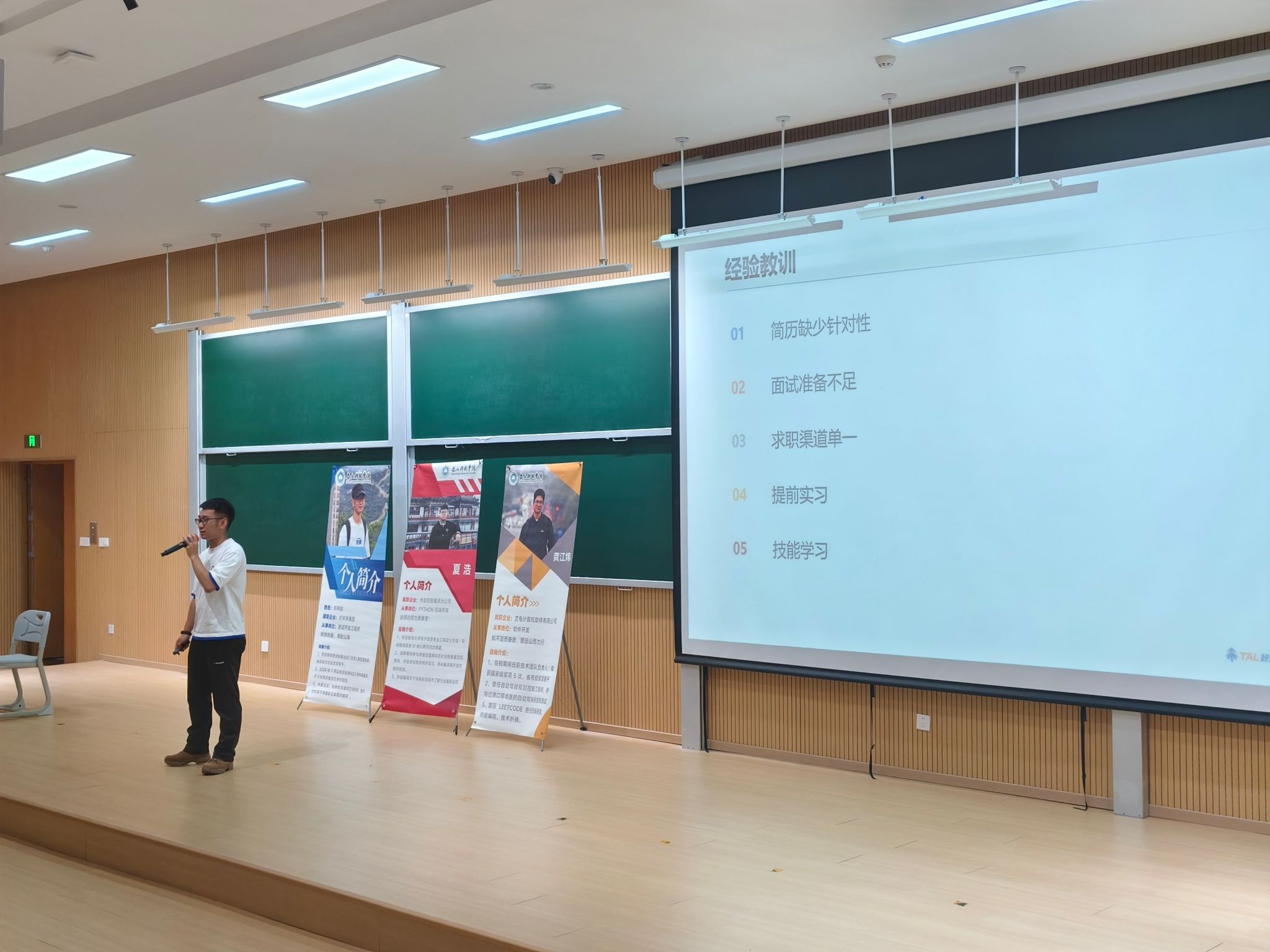 活动伊始,郑辉航学长结合大三实习求职经历,指出求职需注重制作针对性简历、做好面试准备、拓宽渠道,同时重视提前实习和技能提升。在职业规划上,他提出“长短线结合”思路:长线要求学生夯实学业,参与实践活动积累经验;短线强调优化简历、关注招聘信息,面试前后做好调研与复盘。此外,他提醒学生在角色转变中要调整行为模式,明确职责。作为“双轨制”发展典型的夏浩学长,分享研究生阶段学术研究与求职并行经验,介绍考研历程与秋招策略,强调简历需突出重点、精准匹配岗位,并分享通过实习积累经验、定向投递获取offer的方法。龚江炜学长结合自身求职逆袭经历,鼓励学生要大胆积极尝试。他提出提升通用能力的四个路径:深化专业知识、强化基础技能、争取证书荣誉、注重综合素养,同时强调自信、沟通和克服拖延对职业发展的重要性。