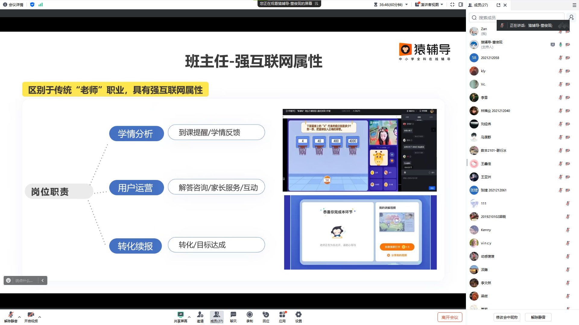 在宣讲会上,猿辅导董经理首先就企业的整体情况进行了详细介绍。作为一家知名的在线教育企业,猿辅导以其先进的教学理念和创新的教学模式,赢得了广大学生和家长的信赖。他详细阐述了公司的发展历程、企业文化、核心优势以及行业地位,使同学们对公司有了更加全面和深入的认识。他指出,公司自创立之初便秉承先进的教育理念,并在线教育领域不断探索,逐步成长为行业的领军企业。董经理详细介绍了教研团队的努力与成果,并着重说明了公司在技术平台方面的优势,充分展现了猿辅导在教育领域的专业实力。