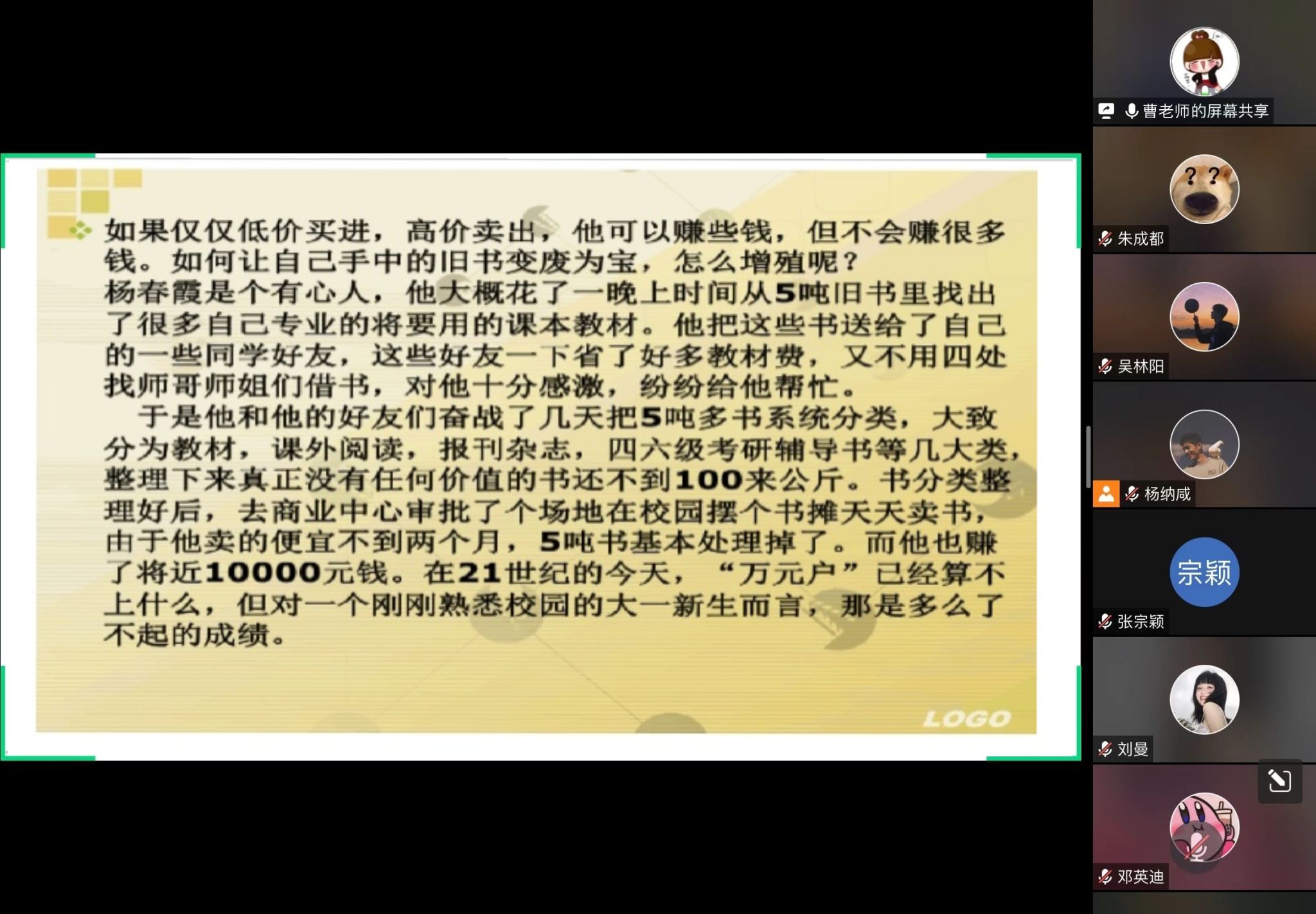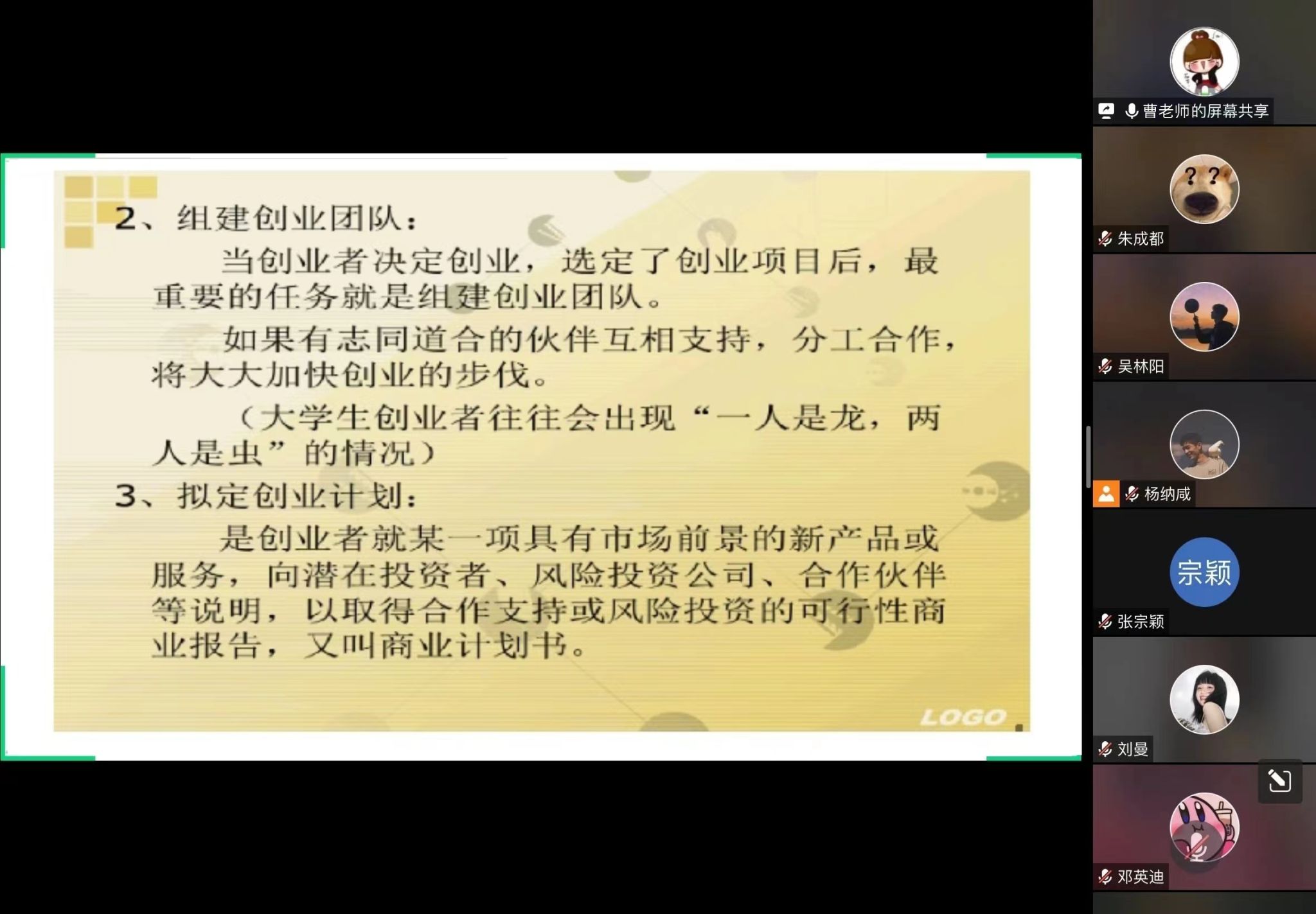 其次,曹老师还着重讲解了如何选定创业项目、组建创业团队、拟定创业计划、筹集创业资金、办理创业的有关法律手续和创业计划的实施与管理,指导学生认识自身性格、专长、实力和所处环境,提升组织能力、社会协作和团队配合,以平和的心态正确看待创业,并且她还总结了几种大学生创业的常见模式、大学生创业的优势和当下的创业方向,给同学讲解了创业中可能会出现的一些问题。在她的循循善诱下,同学们由此客观认识了一些创业模式的优缺点,了解了几个可行可实践的创业思路,对未来的创业生活充满了期待。