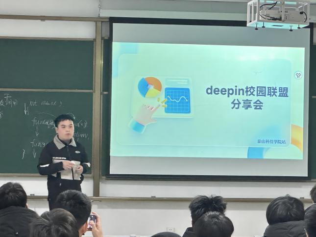 为响应我国《“十四五”软件和信息技术服务业发展规划》的贯彻落实,建设有国际影响力的开源社区,拓宽校企供需人才对接途径,拉近学生与企业之间的距离,尽快适应学校与职场的过渡,大数据学院团总支·学生会就创服务部于2023年12月13日下午14时,在J3-306教室举办【有为青年】系列活动——第二期deepin校园联盟分享会,本次活动邀请大数据管理与应用(专升本)23-1班李超同学进行分享,50余名同学报名参与。