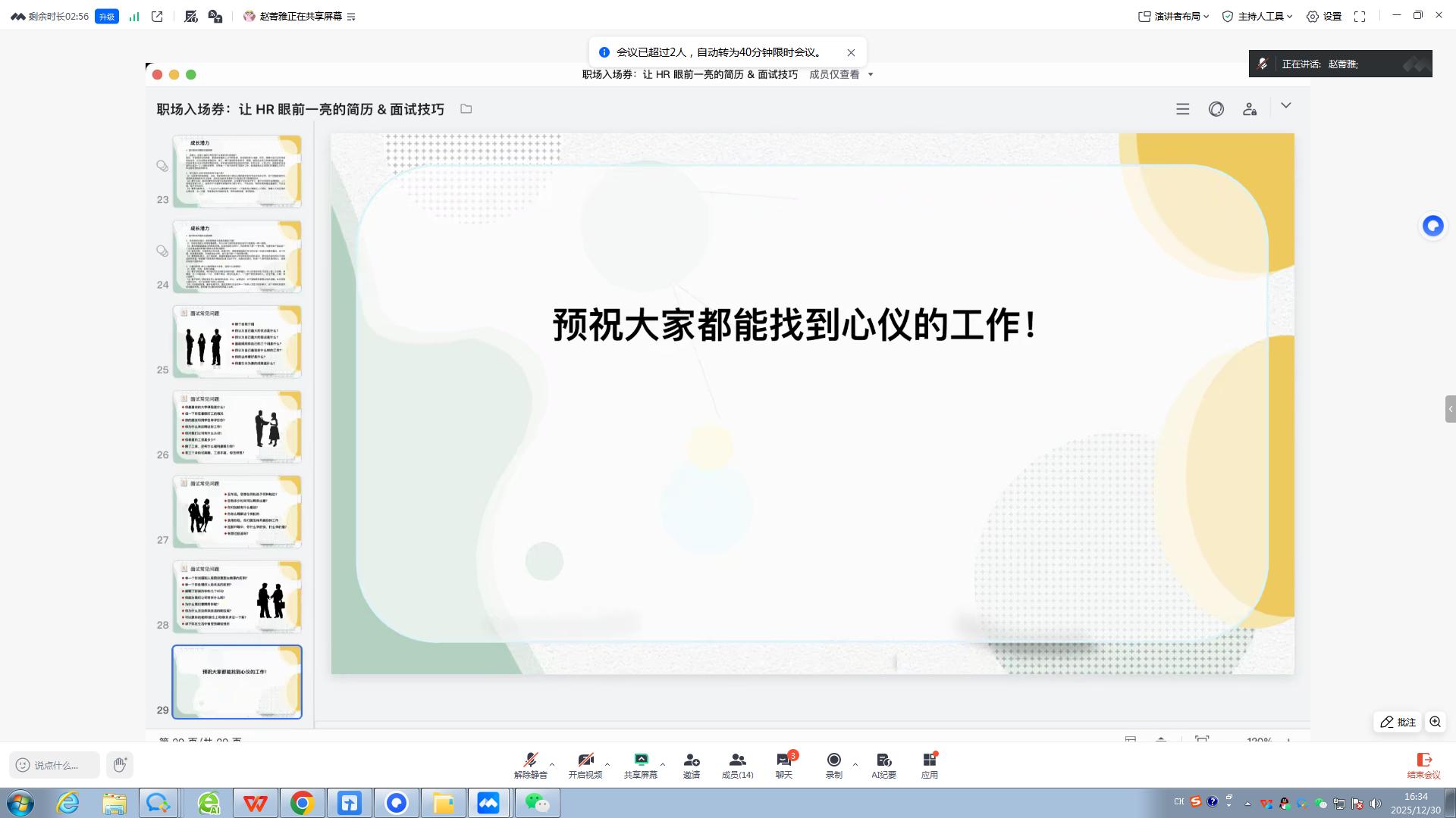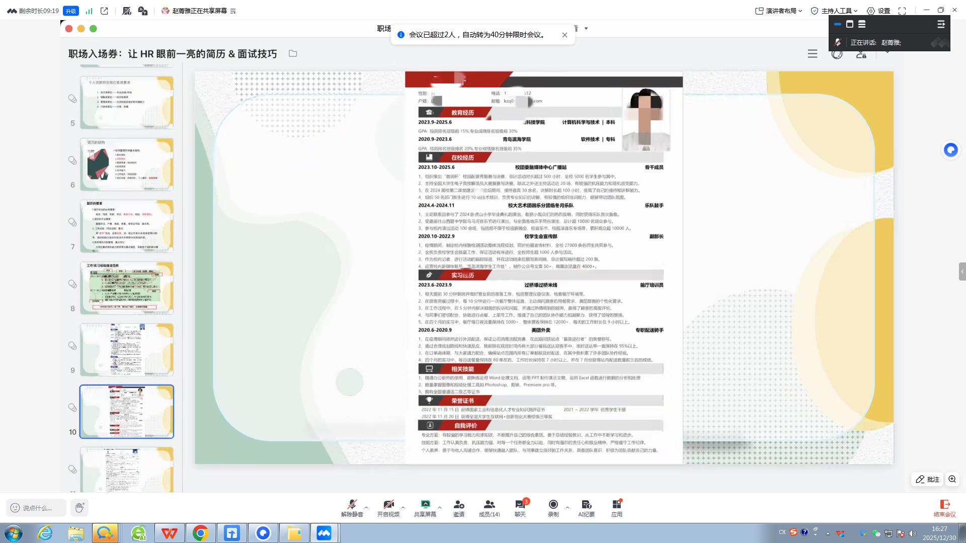 为帮助学子精准把握职场准入关键环节,提升就业竞争力,12月30日,大数据学院职场先锋班成功举办“职场入场券:让HR眼前一亮的简历&面试技巧”主题就业沙龙。活动特邀双体软件精英产业学院职场导师赵菁雅主讲,为在场学子带来了一场兼具实用性与指导性的就业技能提升盛宴。