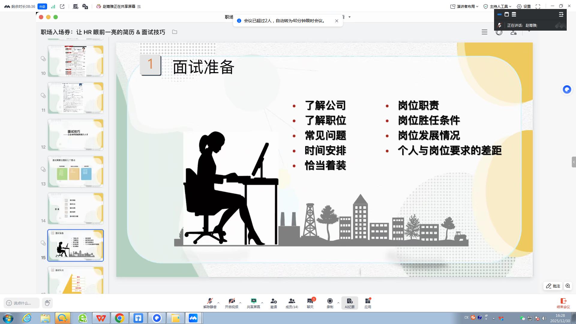 面试环节指导中,赵导师从面试准备、礼仪规范、过程把控、结束跟进四个维度展开讲解。她提醒学子,面试前需深入了解公司背景与岗位职责,精准匹配个人优势与岗位需求;着装得体、举止大方是第一印象的关键,握手力度适中、肢体语言自然等细节能充分展现职业素养。针对自我介绍这一核心环节,她建议按照“基本信息—学习工作经历—岗位认知”的逻辑架构,实现个人优势的精准营销。