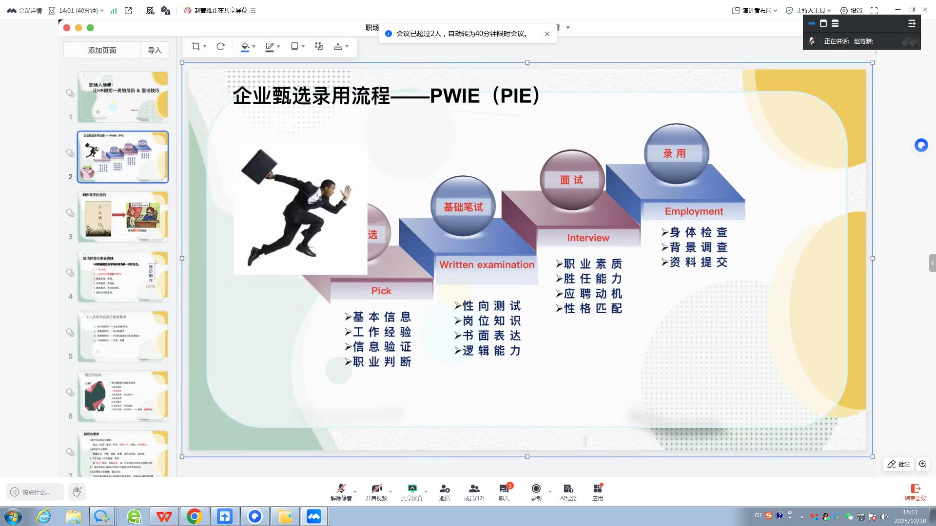 赵老师以企业甄选录用流程PWIE(Pick-Written examination-Interview-Employment)为切入点,系统解析了简历甄选、基础笔试、面试考核及最终录用四大核心环节的考察重点。她强调,简历作为求职第一关,是获得面试机会的核心敲门砖,HR平均仅用8—10秒筛选一份简历,简洁精炼、重点突出的简历才能脱颖而出。