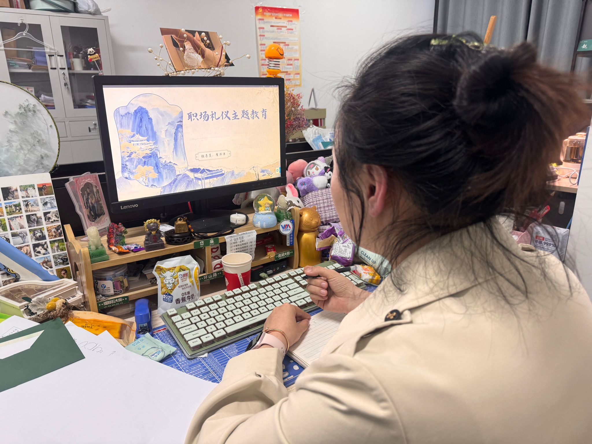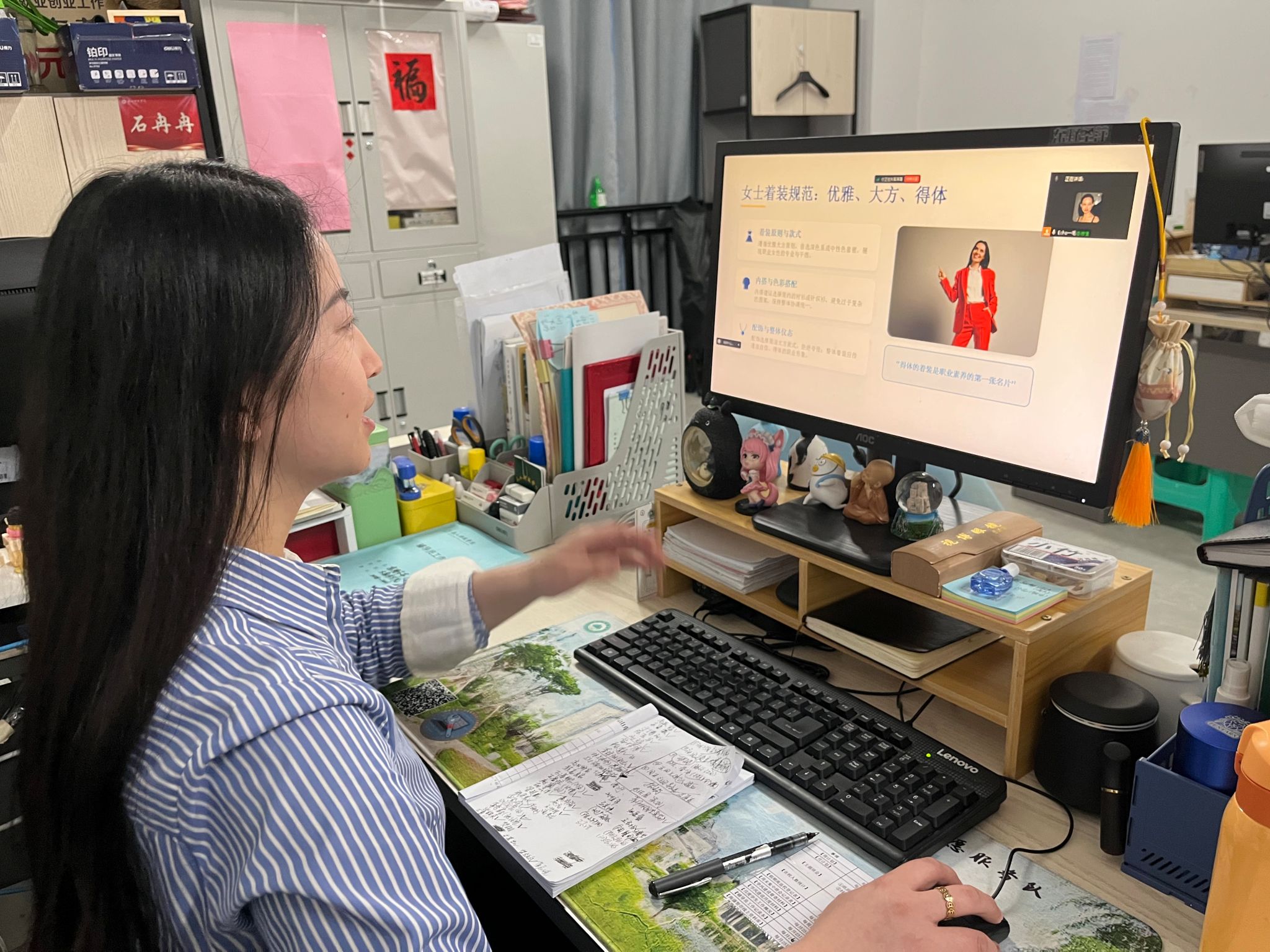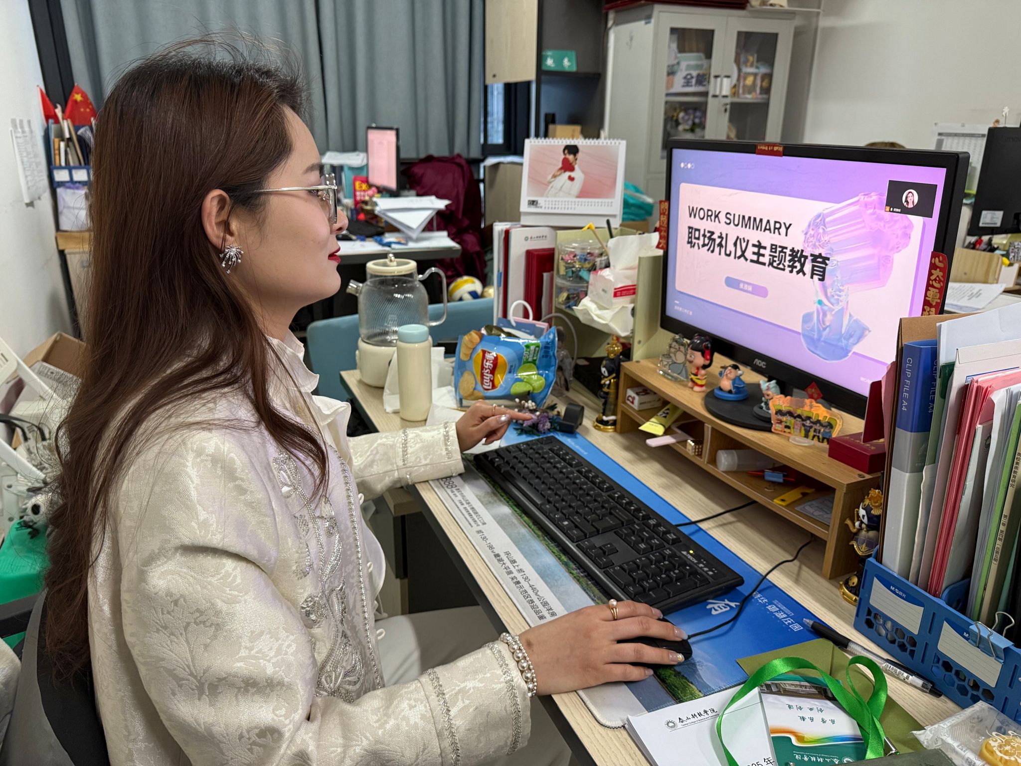 辅导员东野圣萍老师通过线上会议开展了职场礼仪专题教育。她从第一印象的重要性切入,详细讲解了职场着装的TPO原则,建议新入职阶段宁可稍显正式也不可过于随意。通过正反案例对比,示范了得体的握手、交换名片、微笑问候等初次见面礼仪,并强调记住同事姓名、主动问好是融入团队的基础。在线上沟通方面,东野老师指出商务邮件要有清晰主题、规范称呼、简洁正文及礼貌结尾,工作群内避免发送语音长消息和表情包过度使用。她还讲解了会议礼仪及尊重多元文化背景等要点,提醒同学们提前了解对方习俗与禁忌。