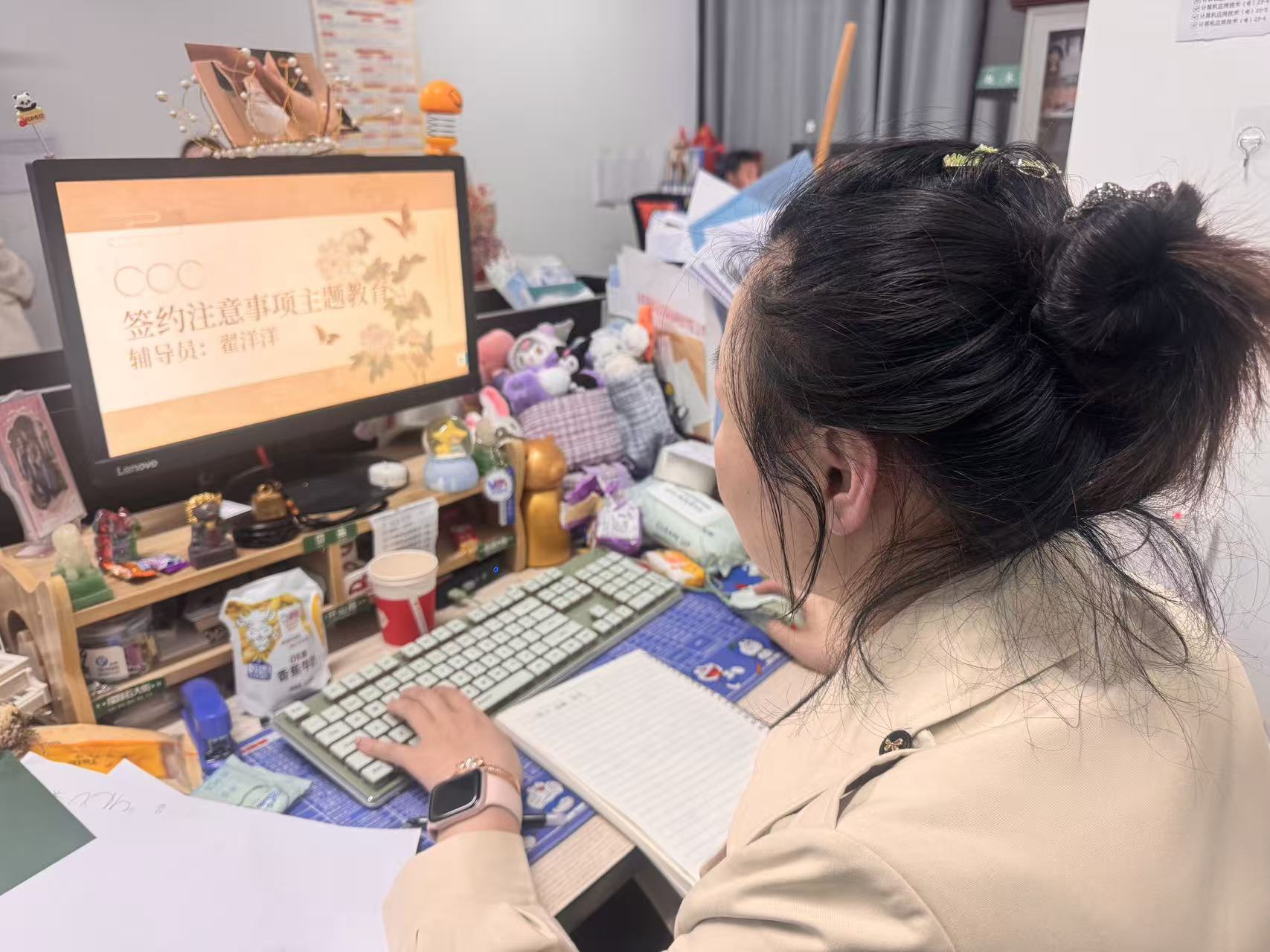 辅导员翟洋洋以典型案例为切入点,采用以案释法、以案警示的方式,用通俗直白的语言拆解签约过程中的常见风险点,细致传授规避技巧。互动答疑环节,针对学生提出的各类签约疑问,翟洋洋一对一耐心解答,现场指导学生梳理签约重点,让学生在交流中明晰风险、掌握方法。