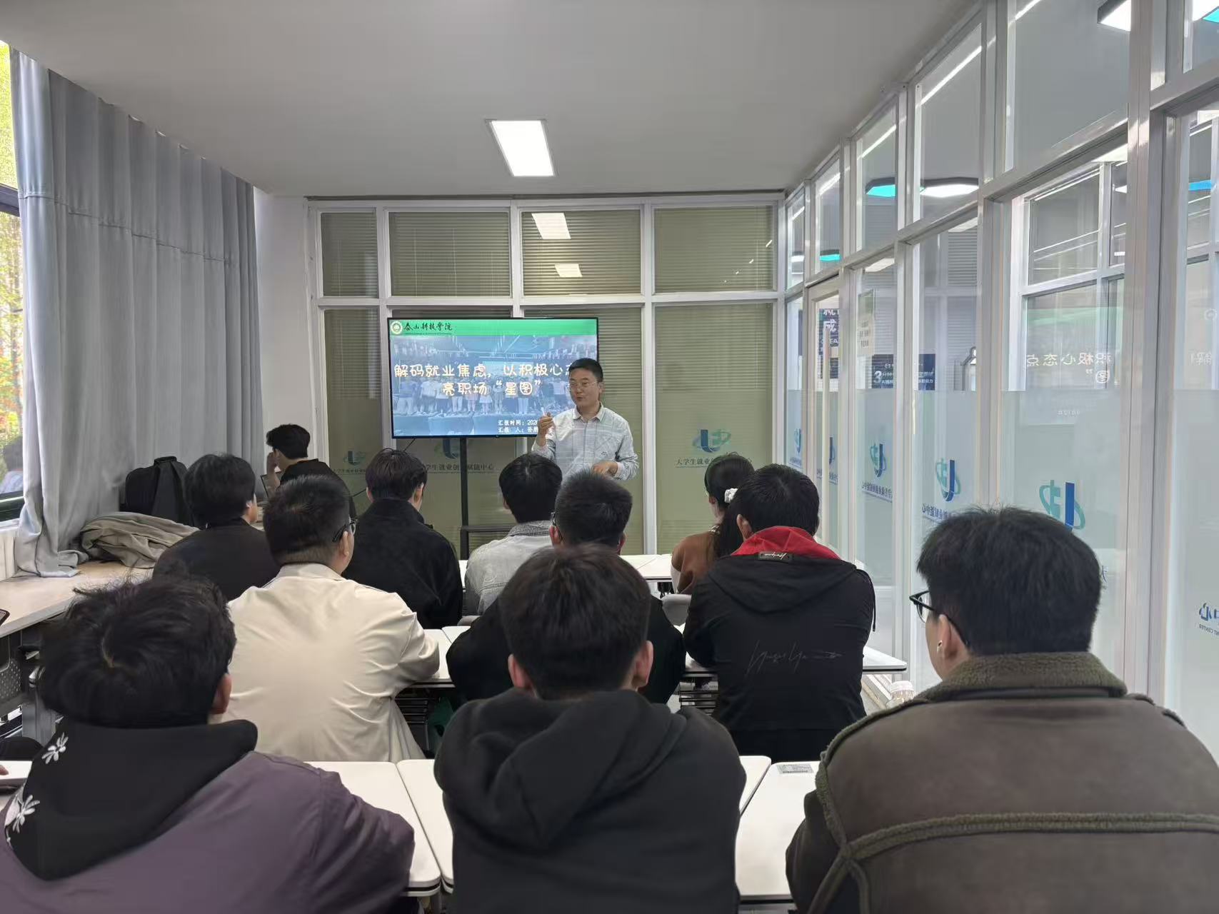 接着,孙老师结合往届优秀学生就业案例,详细分析了理工类专业的就业优势,鼓励同学们摒弃求职懈怠、被动等待的心态,切勿忽视四六级、计算机证书等基础能力积累。他重点围绕求职核心,提出三大实用建议,一是秉持先就业再择业理念,先拿下保底工作抢占就业主动权;二是做到笨鸟先飞,牢牢抓住“金九银十”黄金求职期,主动多渠道搜集招聘信息;三是学会借力筑巢,合理利用身边人脉资源。同时他还叮嘱同学们注重行测、心理测试等求职能力提升,以充分准备应对求职考核,用扎实本领化解就业焦虑。最后孙老师寄语大家脚踏实地、勤学苦练,以自信从容的姿态迎接未来挑战。