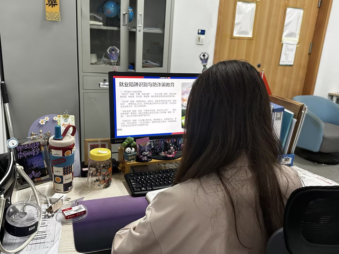 辅导员翟洋洋结合所带毕业班级需求,开展“精准防骗,安全求职”专题宣讲。她拆解不同的诈骗套路,重点关注实习协议与劳动合同区别、试用期薪资、社保缴纳等热点问题,提醒同学们警惕“实习无薪资”“虚假offer”等隐形陷阱。通过案例对比,她清晰讲解正规与诈骗招聘流程的差异,指导学生甄别招聘信息、解读合同条款,避免陷入骗局。同时,她组织互动问答和情景模拟,确保防骗知识入脑入心、学以致用。