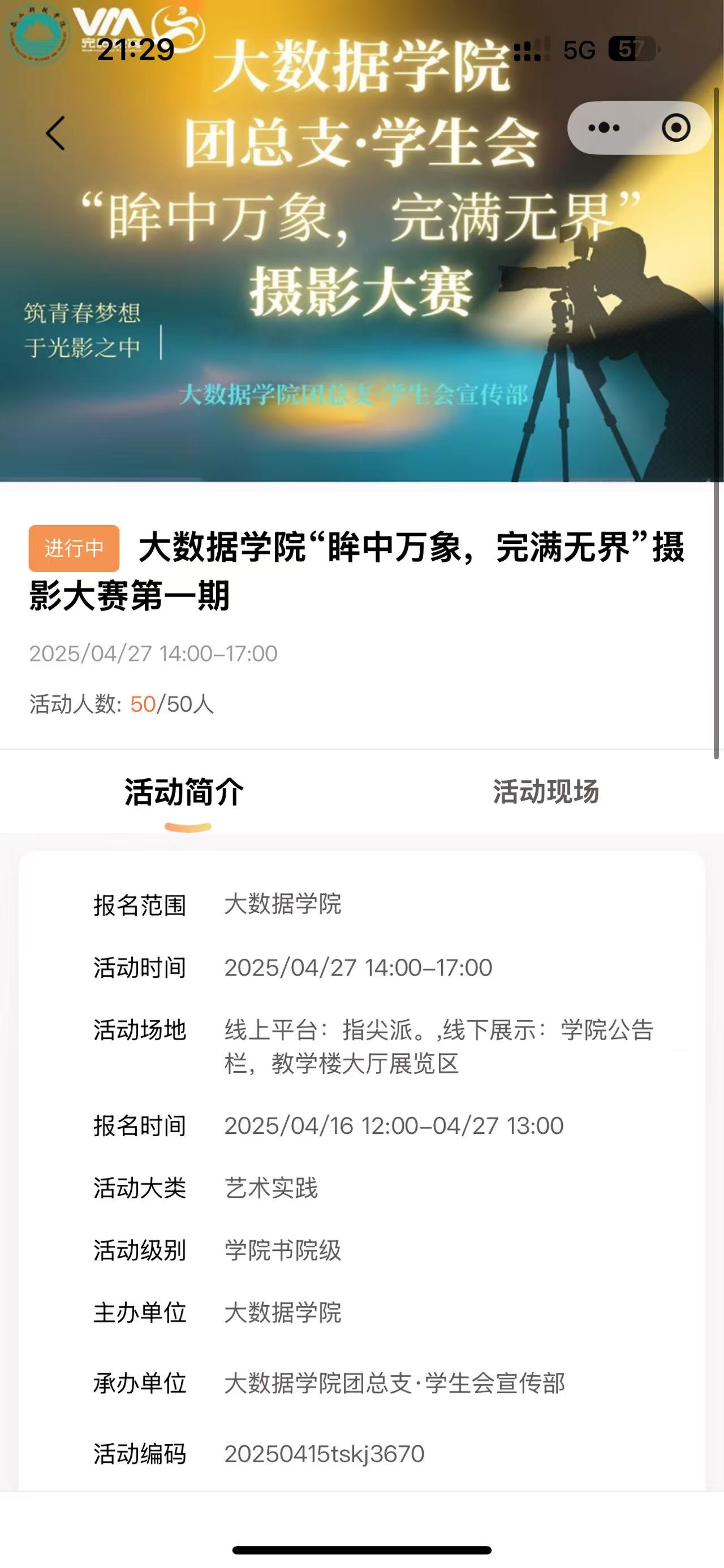 此次线上摄影大赛为同学们提供了一个展示自我、交流分享的平台,让大家在忙碌的学习之余,能够静下心来发现生活中的美,用摄影的方式表达内心的感受。同时,也进一步推动了校园文化的繁荣发展,展现了大数据学院学子积极向上的精神风貌与对生活的热爱。期待未来能有更多这样的活动,让同学们在艺术与创意的海洋中尽情遨游。