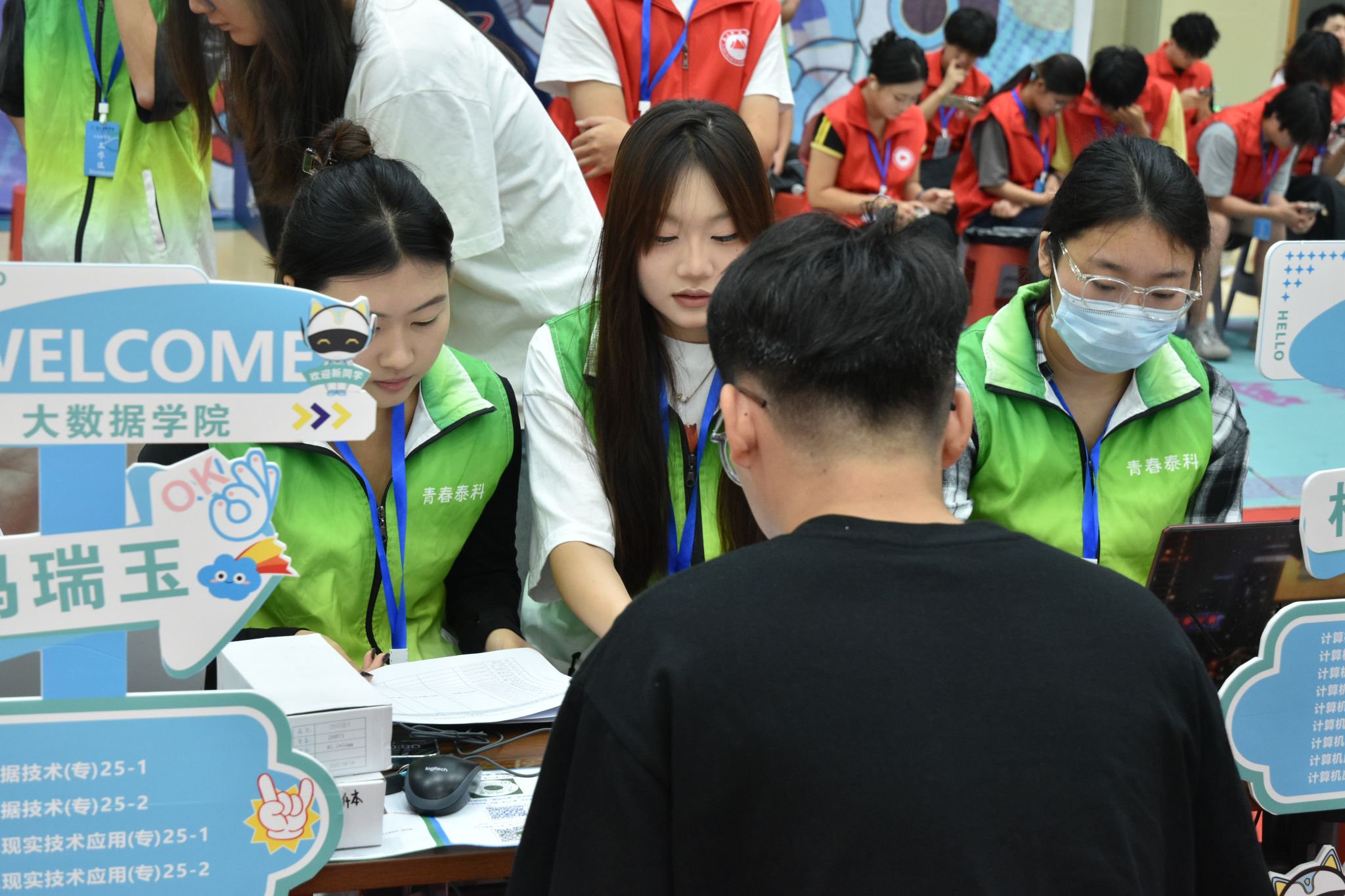 新生刚到校园,就能在岳动馆的大数据接待区找到“组织”。各班班助在现场忙着帮大家登记注册、核验材料、发放一卡通,面对新生提出的 “宿舍在哪”“食堂有什么好吃的” 等问题,也耐心一一解答,很快就能完成报到。现场不仅开了多个专业报到窗口,还设了绿色通道,学院领导和辅导员也全程在现场 “坐镇”,遇到问题随时解决,报到流程一路顺畅。