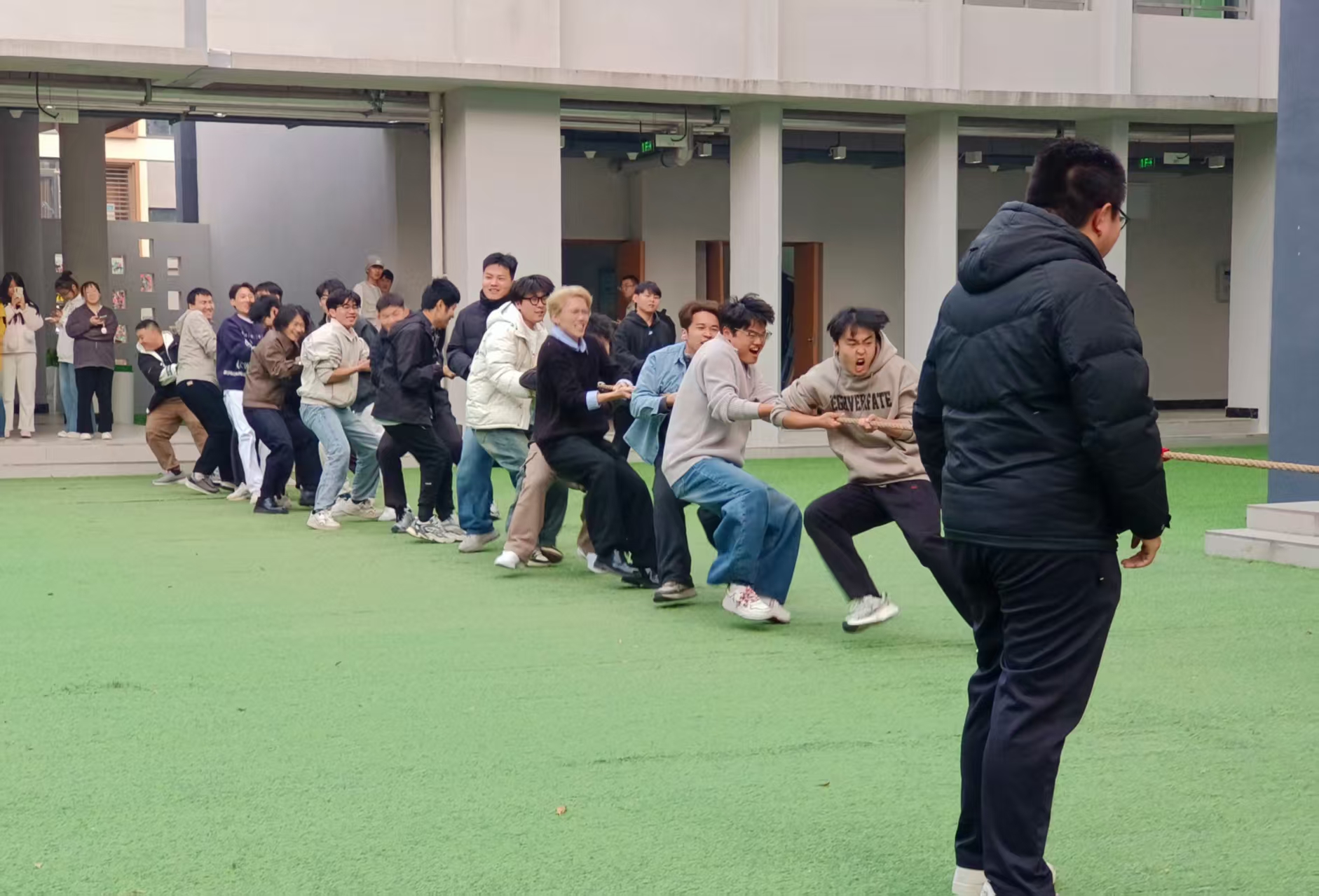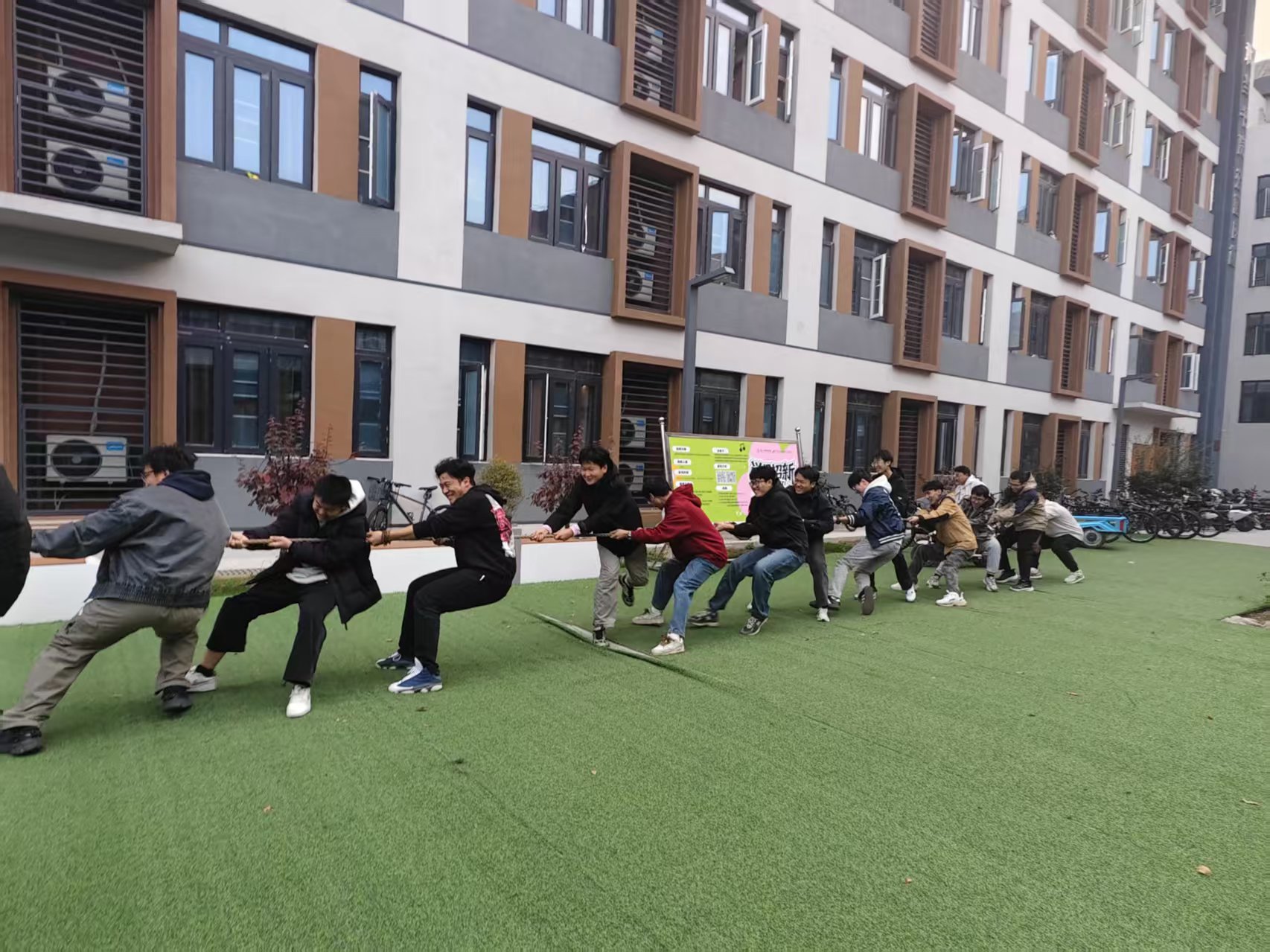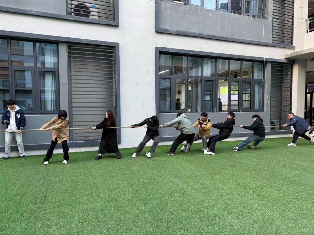 11月14日下午,大数据学院计算机科学与技术(专升本)25-3班团支部在敢当书院庭院举办“凝心聚力,绳采飞扬”拔河主题活动,全体同学踊跃参与,以文体活动践行完满教育理念,凝聚班级力量。新学期刚组建的班级,同学间交流多局限于课堂。活动于15:30正式启动,主持人介绍规则与安全事项后,各队伍赛前围圈讨论战术、分工协作,生疏感快速消解。裁判哨响,队员们弓步屈膝、紧握长绳,额角冒汗仍坚持不懈;绳中央标记来回拉扯,场边“助威团”喊着整齐号子,氛围热烈。有队员手心磨红仍坚持参赛,落后队伍互相鼓劲追赶,赛场满是协作默契与拼搏热情。活动尾声,同学们齐聚合影,纷纷表示通过拔河拉近了彼此距离,深刻体会到同心协力的班级力量。此次活动不仅让大家锻炼身体、释放压力,更增强了班级凝聚力,为班级建设奠定温暖基础。未来,支部将持续推出 “轻量级、高参与”活动,让班级成为同学们的温暖港湾。