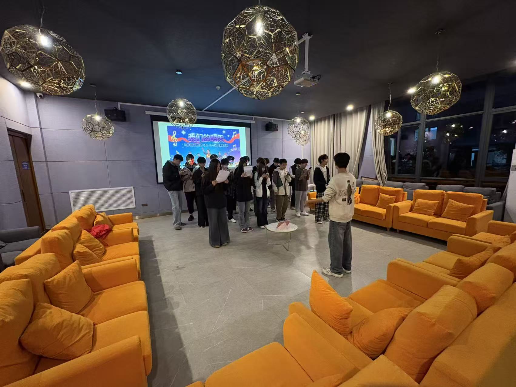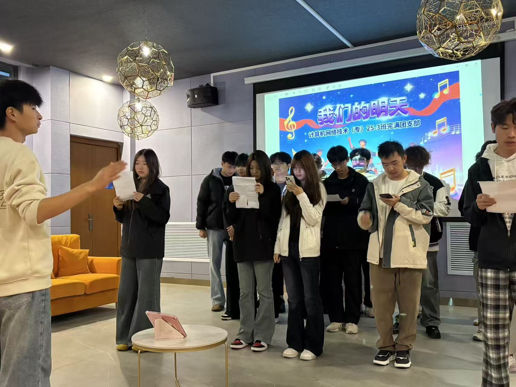 计算机网络技术(专)25-3班团支部在校园活动空间举办《我们的明天》合唱交流活动,全体同学暂释学业忙碌,以歌声凝聚集体力量。筹备阶段,团支部精心调试音响、设计背景画面、打印歌词稿。暖黄灯光与幕布上“我们的明天”主题字样营造出温馨氛围,让同学们卸下拘谨。活动伊始,面对和声编排,演唱稍显青涩,但大家毫不气馁,组织者引导分声部练习,声乐特长同学分享技巧,经反复磨合,歌声渐趋舒展动人,融入班级朝气与对未来的憧憬。活动中,同学们卸下专业学习的严肃,为同伴鼓掌、纠正音调、分享音乐故事,陌生感悄然消解。尾声,大家合影定格笑脸,留存青春记忆。此次活动不仅丰富校园生活,更让协作精神扎根班级,为同学们的求学路注入温暖动力。